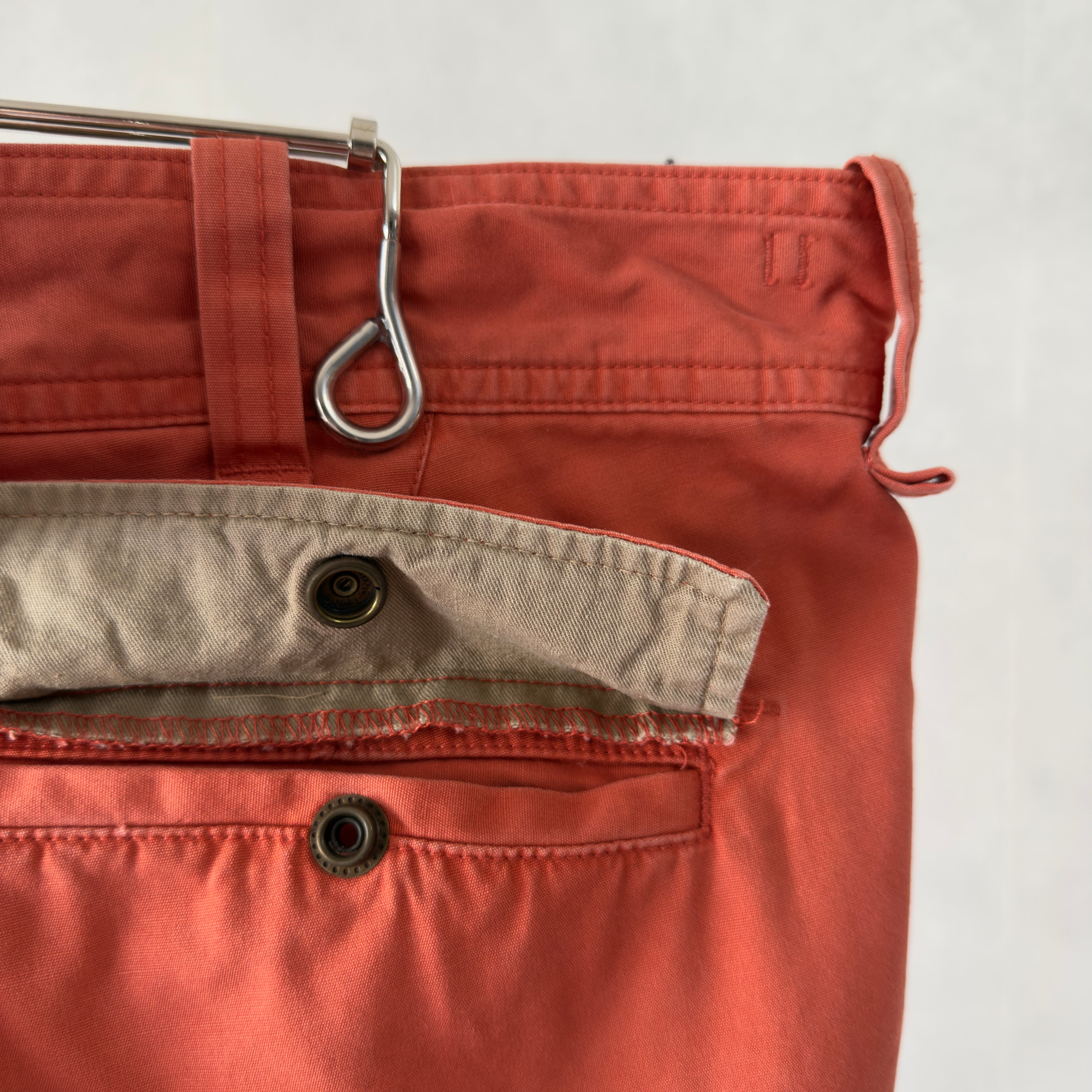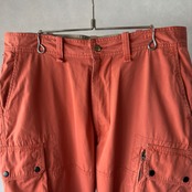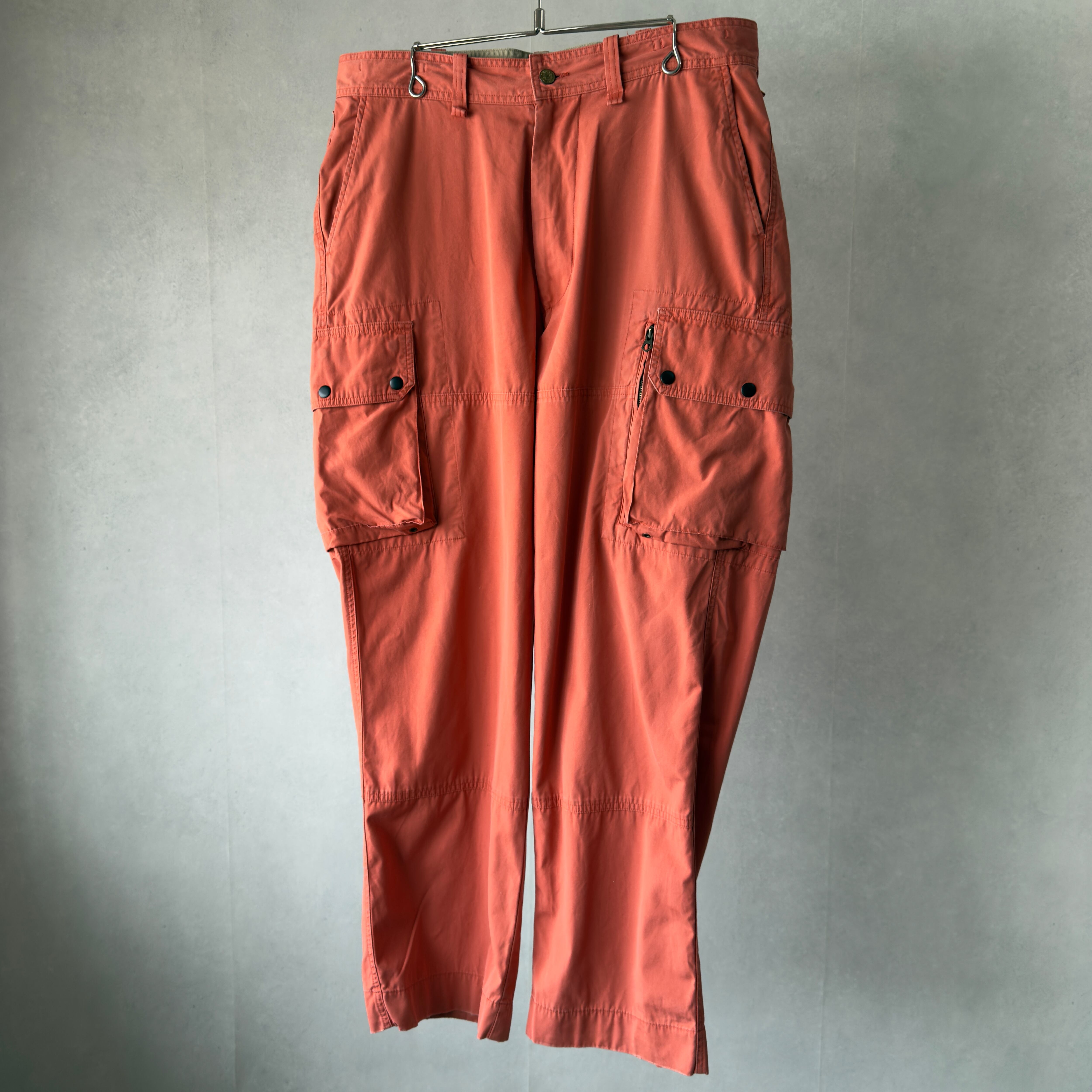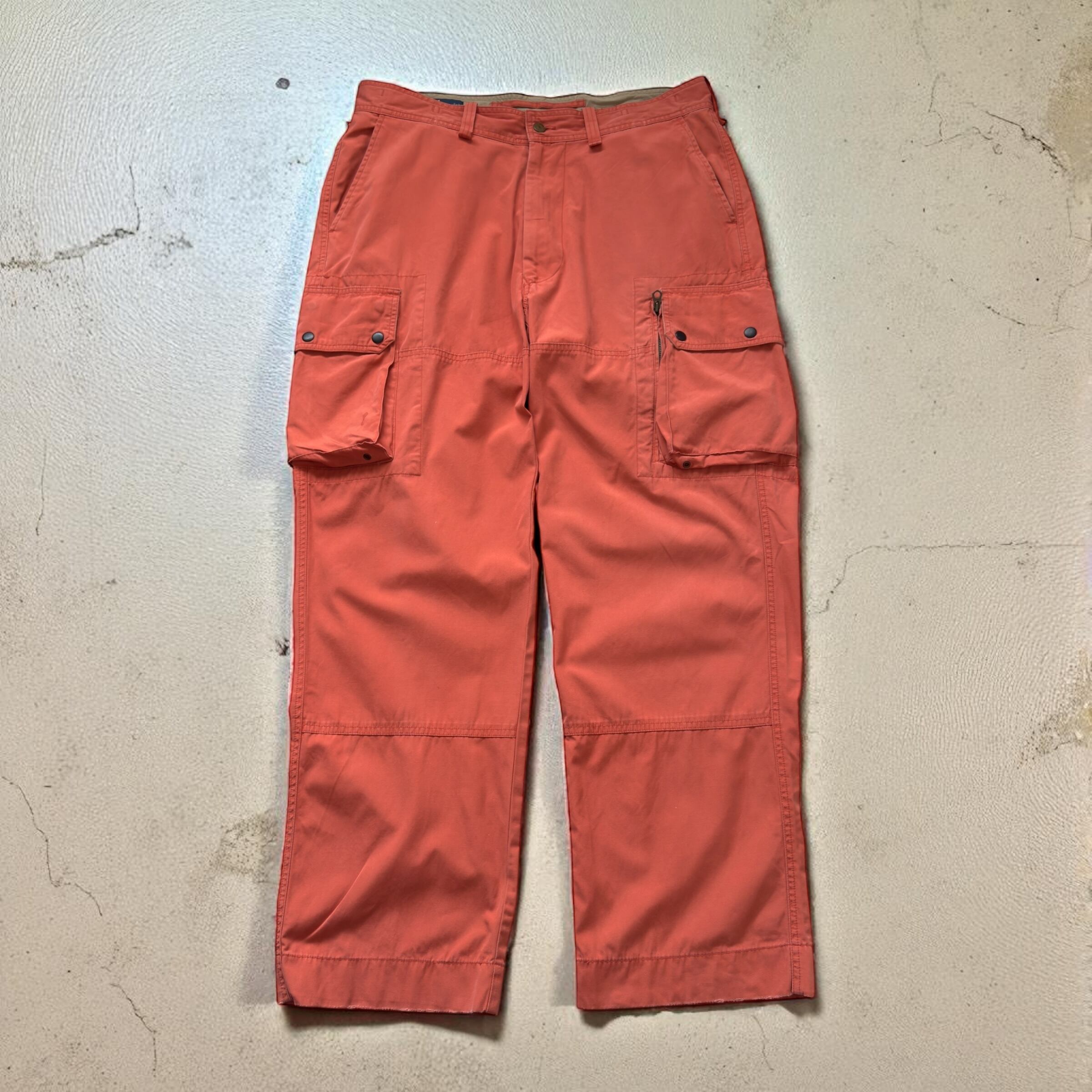ポロ・ラルフローレンのカーゴパンツ。鮮やかにフェードしたオレンジカラーが映える一本で、存在感抜群のアイテム。左右に大きめのカーゴポケットを配置し、片方はジップ付きで実用性も◎