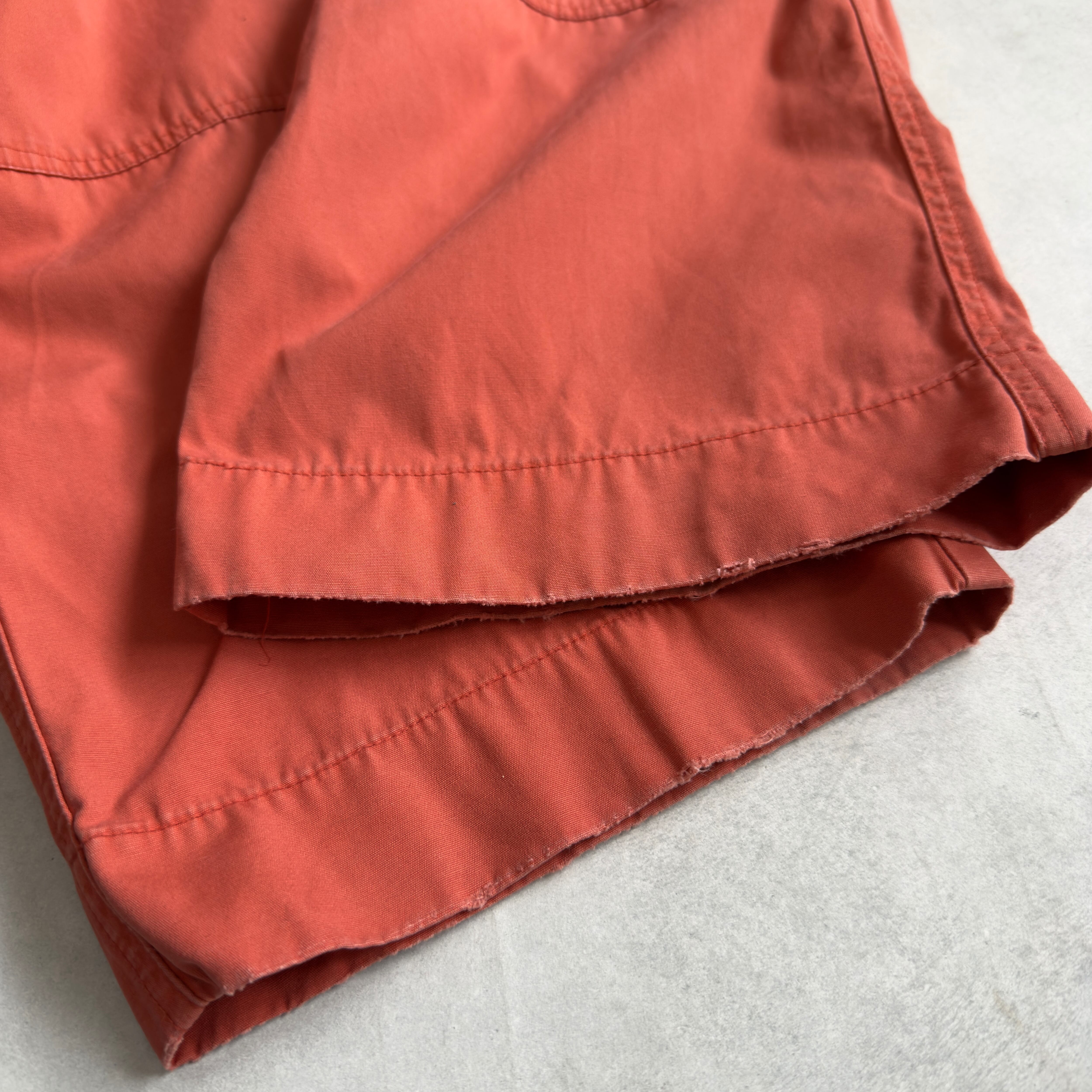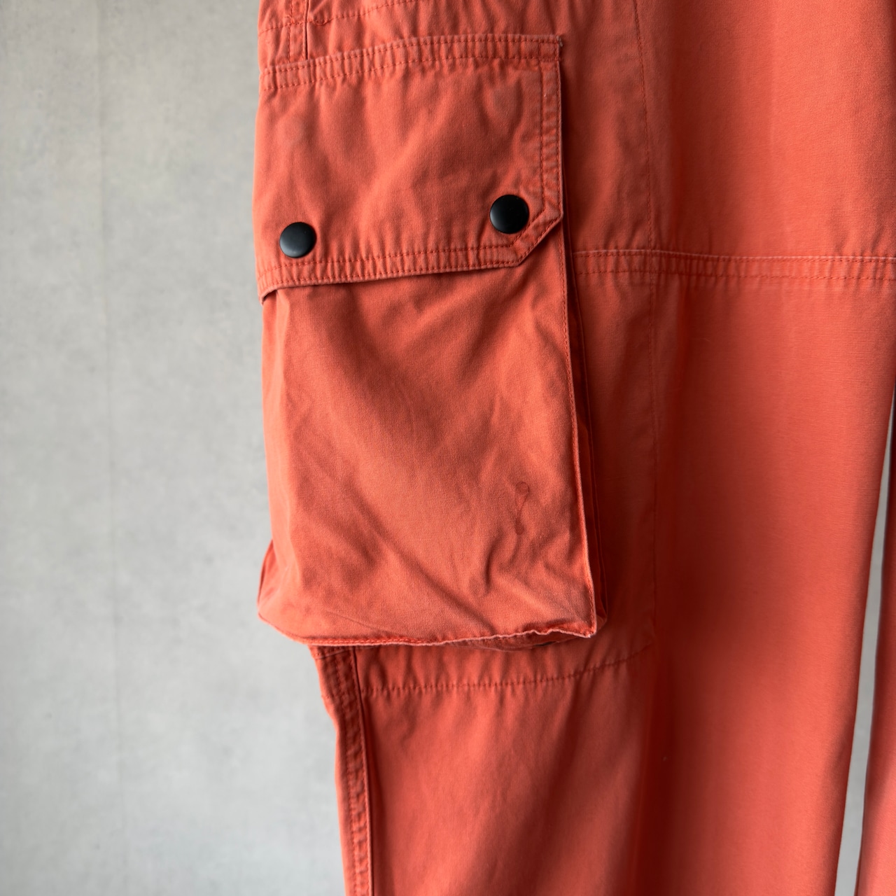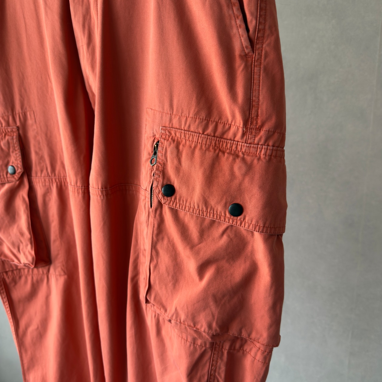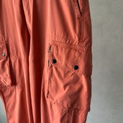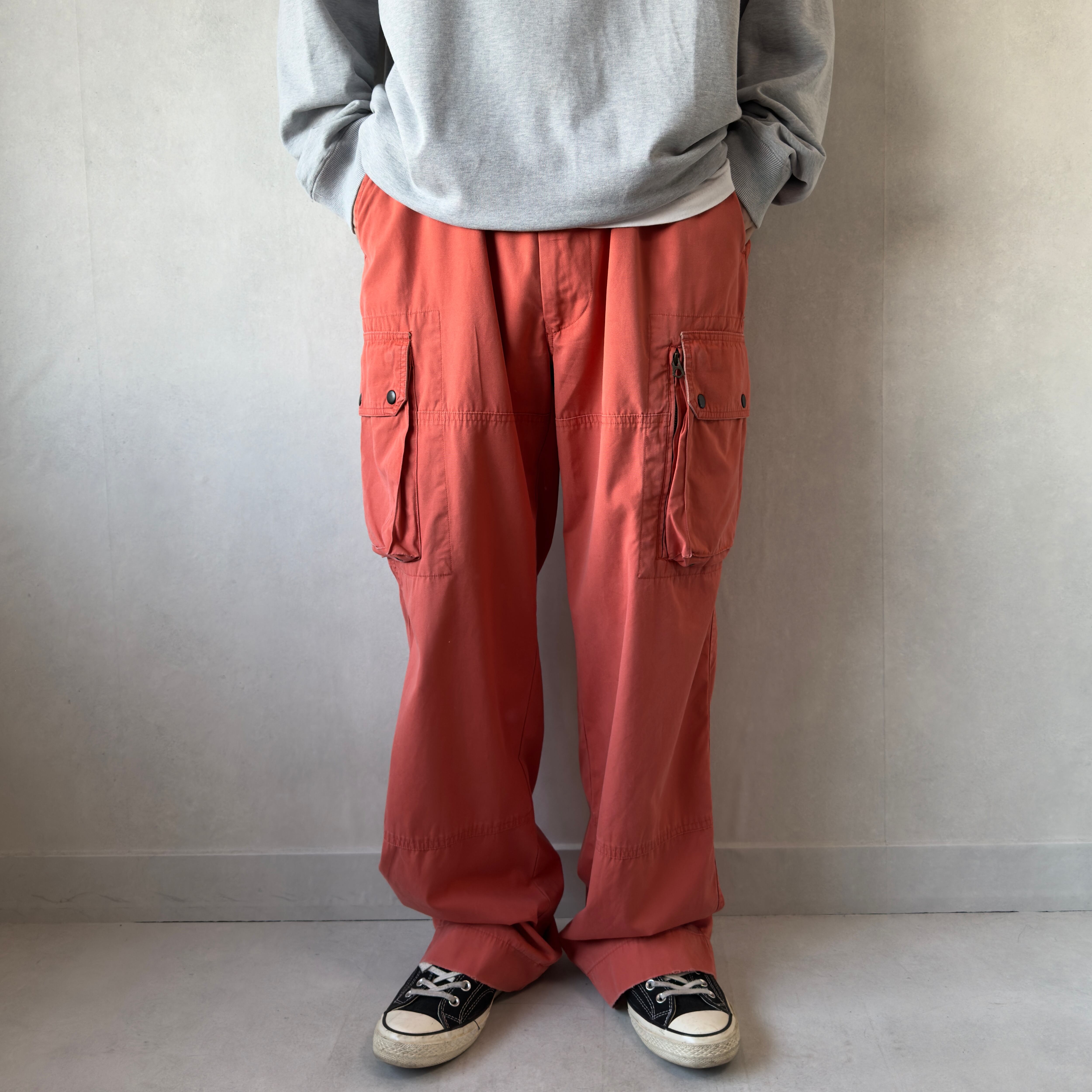 ポロ・ラルフローレンのカーゴパンツ。鮮やかにフェードしたオレンジカラーが映える一本で、存在感抜群のアイテム。左右に大きめのカーゴポケットを配置し、片方はジップ付きで実用性も◎