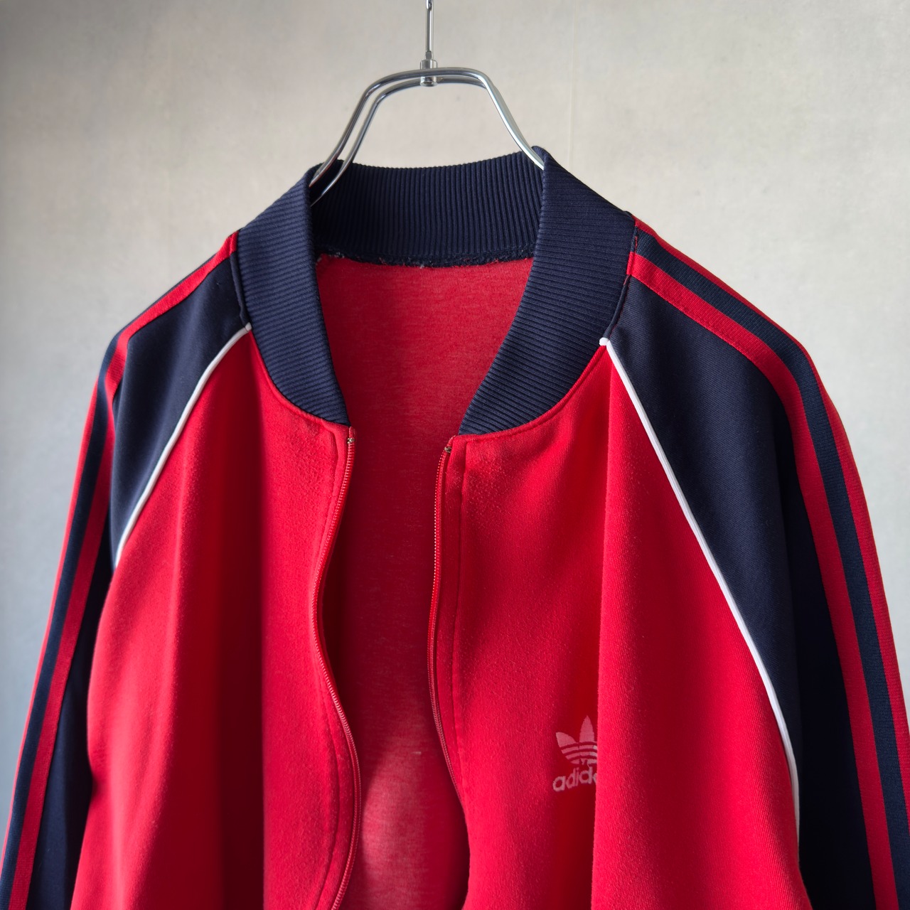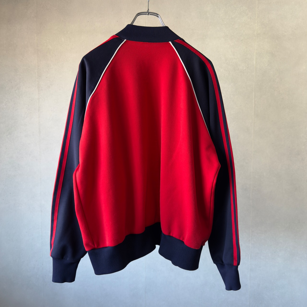 レッド×ネイビーの切り替えにホワイトパイピング、肩から袖にかけての3ストライプと、クラシック感漂うデザイン。胸には王道トレフォイルロゴの刺繍入り。