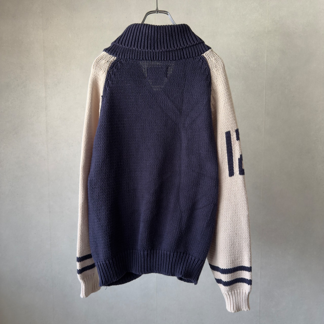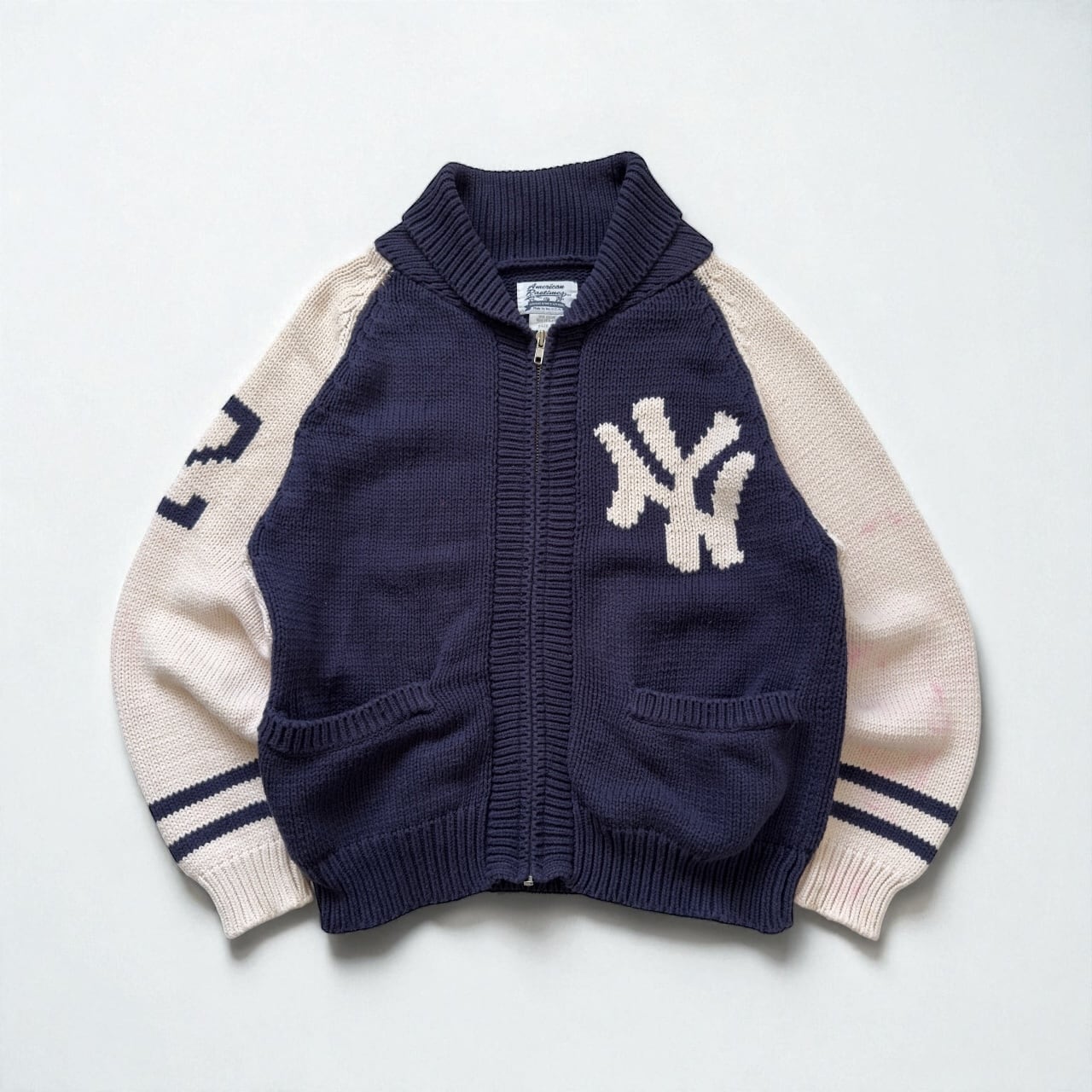 ネイビー×オフホワイトの配色に、胸のNYロゴと袖のナンバリングが効いたクラシックな一枚。