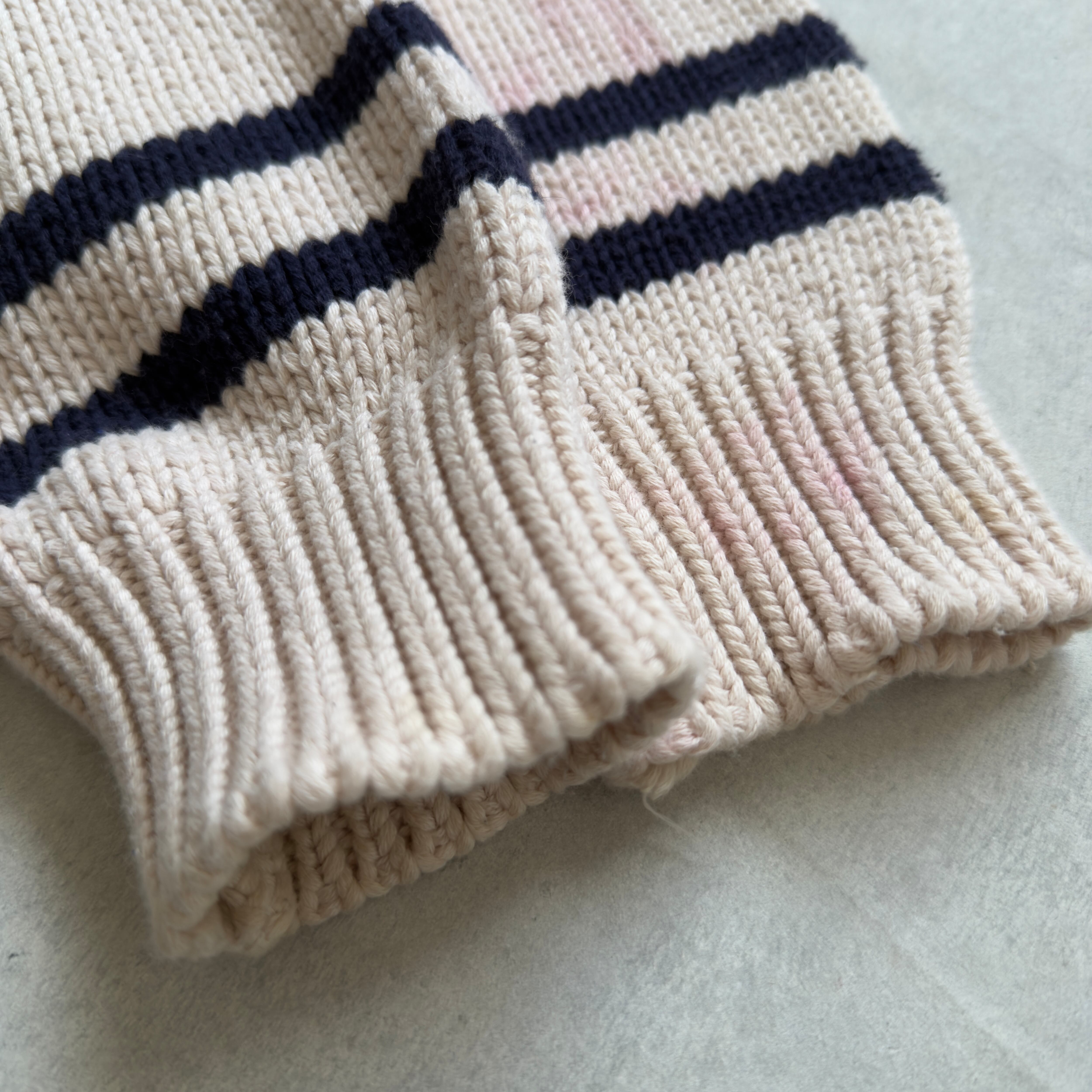 肉厚なコットンニットで編まれていて、しっかりした作りながら柔らかい着心地です。